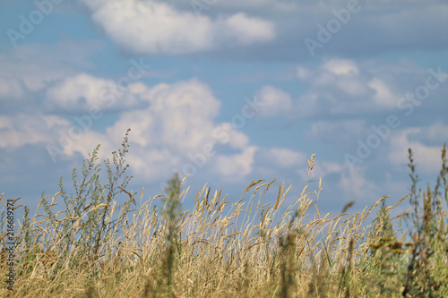 Fototapeta premium Wildwiese mit blauem Himmel und Wolken im Hintergrund