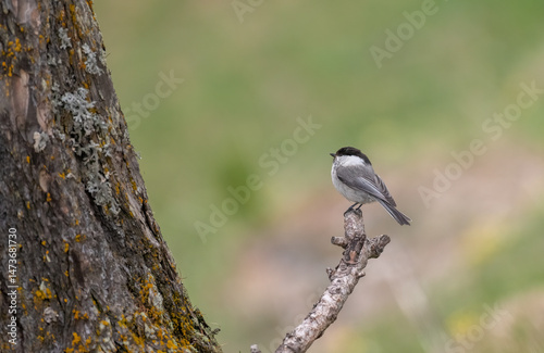 © Dario, Obraz premium Willow tit (Poecile montanus) perching on a dry brach on pastel colors background, Alps, May, Horizontal.