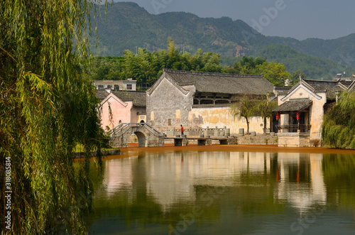 © Reimar, Fototapeta premium Willow trees on the Longxi river with ancient bridge and Hui houses in Chengkan China