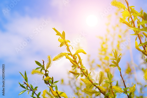 © alinamd, Obraz premium Willow twigs and sun on sky background. Easter and spring concept.