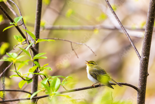 © Lars Johansson, Fototapeta premium Willow warbler singing in a lush forest