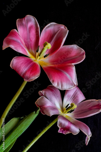 © Мария Цапенко, Naklejka premium wilted pink tulips on a black background