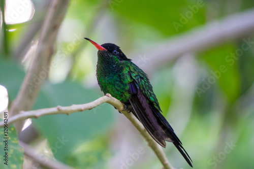 Fototapeta premium Wimpelschwanz Kolibri in freier Natur sitzt auf einem Ast. Er ist das Nationaltier von Jamaika