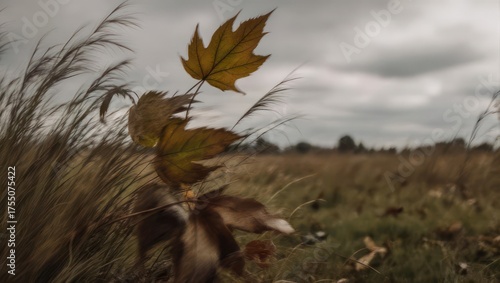 © Jadidua, Obraz premium Wind-blown autumn leaves and tall grass in a field under a stormy sky
