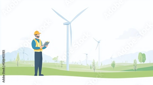 © Montaha Hossain, Obraz premium Wind Energy Technician Inspecting Wind Turbines in a Green Landscape