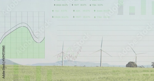 © vectorfusionart, Fototapeta premium Wind farm featuring three rotating turbines in field by hills, with translucent data overlays