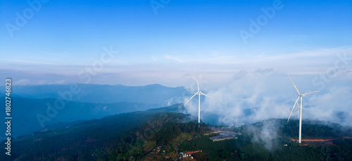 Obraz premium Wind generators with fog and clouds in mountains of Vietnam, industry landscape. Banner Turbines for eco renewable electric power production