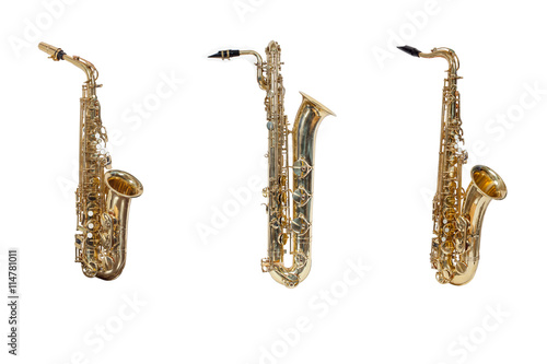 Naklejka premium wind instruments saxophones Alto,tenor,baritone isolated against a white...