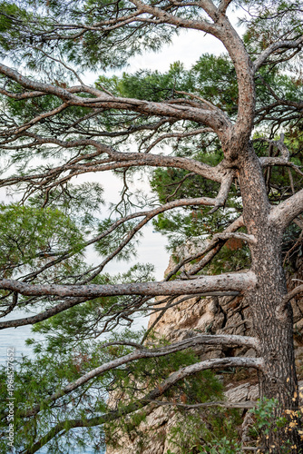© Mirko, Obraz premium Wind-swept pine tree on rocky coastal cliff by the sea