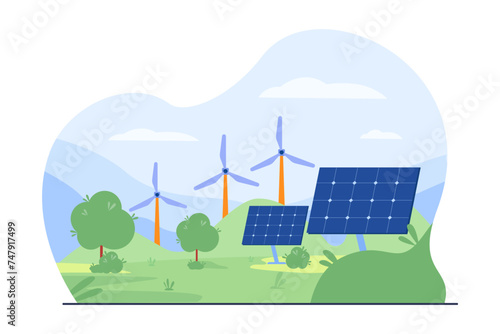 Naklejka premium Wind tribunes and solar panels outdoors vector illustration. Landscape of...