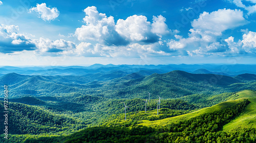Naklejka premium Wind turbines on Blue Ridge Mountains, panoramic view, lush green scenery, clear blue sky, renewable energy concept