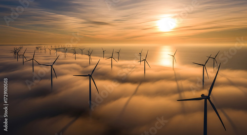 © Designer, Obraz premium Wind turbines rising above the fog at sunrise generating clean energy
