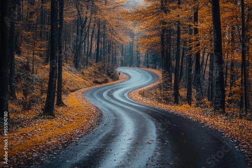 © Lubos Chlubny, Obraz premium Winding asphalt road leading through autumn forest