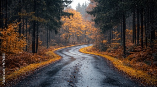 Fototapeta premium Winding asphalt road leading through autumn forest