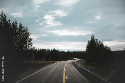 Fototapeta premium Winding asphalt road near a dense fir forest