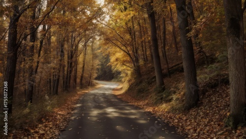 © Jadidua, Obraz premium Winding asphalt road through a forest tunnel during autumn, dappled sunlight filtering through trees