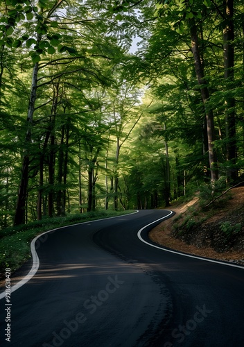 © kinara art design, Obraz premium Winding asphalt road through a lush green forest canopy.