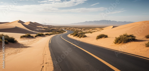 Fototapeta premium Winding asphalt road through a vast sandy desert landscape