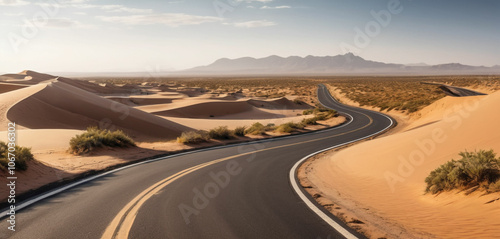 Fototapeta premium Winding asphalt road through a vast sandy desert landscape