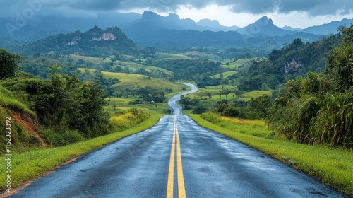 Naklejka premium Winding asphalt road through lush green valley and mountains under a dramatic...
