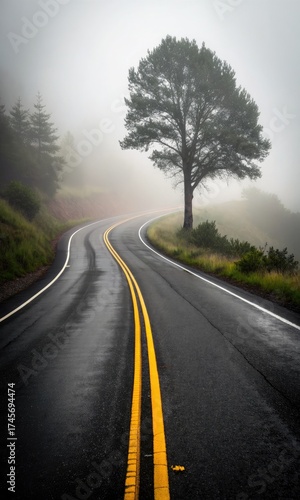 © SIAM, Fototapeta premium Winding asphalt road with double yellow lines disappearing into thick fog and mist