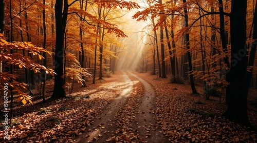 © PencariCuan, Fototapeta premium Winding Autumn Path with Sunlit Golden Leaves - AI Generated