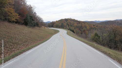 Fototapeta premium Winding autumn road, scenic hills, fall foliage, travel