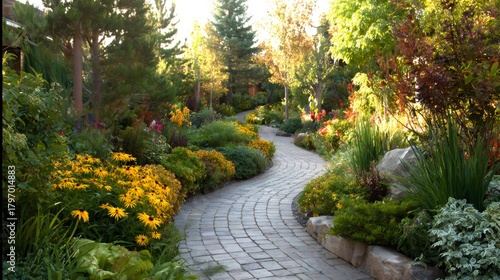 Fototapeta premium Winding brick path curving through a lush botanical garden with vibrant...