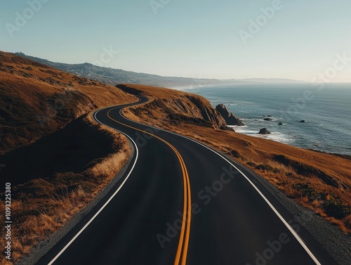 Fototapeta premium Winding coastal road with asphalt surface, overlooking the ocean, coastal highway, scenic drive