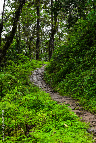 Fototapeta premium Winding cobblestone path climbs into a world of vibrant green foliage. Deep in the woods, finding peace on an old, overgrown trail. A hidden, tranquil journey into the wild of india