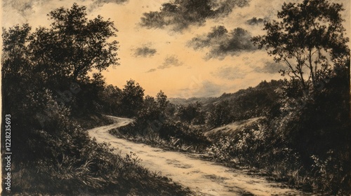 Fototapeta premium Winding Country Road at Sunset Beneath Cloudy Skies