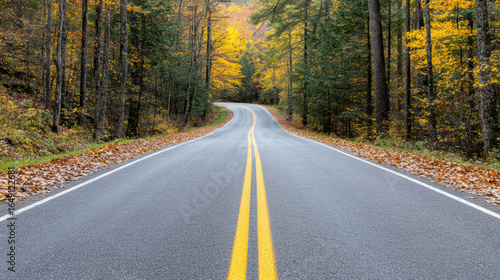 © siraphol, Fototapeta premium Winding country road surrounded by vibrant autumn trees and fallen leaves creates serene