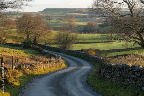 © Yurii Semonov, Obraz premium Winding Country Road Through Patchwork Fields at Sunset