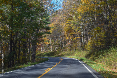 © JudithAnne, Fototapeta premium Winding Country Road Traveling Through Beautiful Fall Foliage