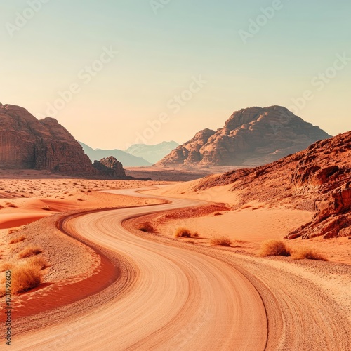 © Nisa, Fototapeta premium Winding desert road through orange mountains
