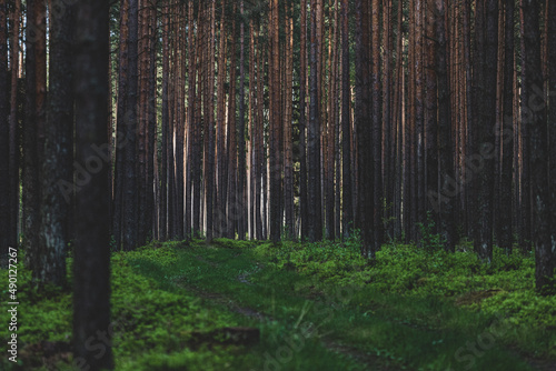 Fototapeta premium Winding dirt gravel road through sunny green pine forest illuminated by sunbeams