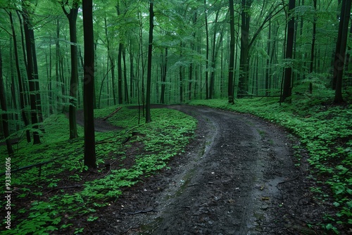 Naklejka premium Winding Dirt Path Through a Lush Green Forest