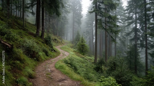 © Kitta Studio, Fototapeta premium Winding Dirt Path Through Foggy Forest Landscape with Trees and Mist