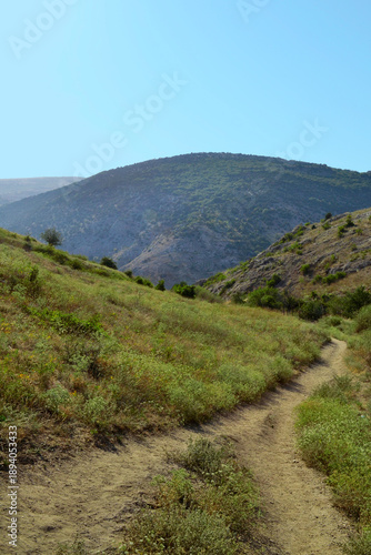 © BatuToYou, Naklejka premium Winding Dirt Path Through Sun-Drenched Coastal Hills Under a Clear Blue Sky