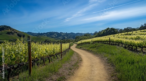 © BerkahStock, Naklejka premium Winding dirt path through vibrant vineyard landscape under a clear blue sky.