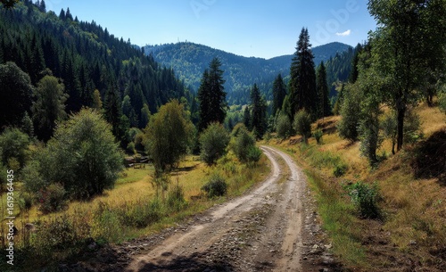 © kremlin, Naklejka premium Winding dirt road through a sunlit valley