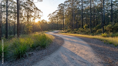 Fototapeta premium Winding Dirt Road Through Forest at Sunset