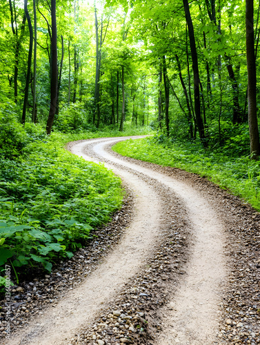 © M, Fototapeta premium Winding dirt road through lush green forest (1)