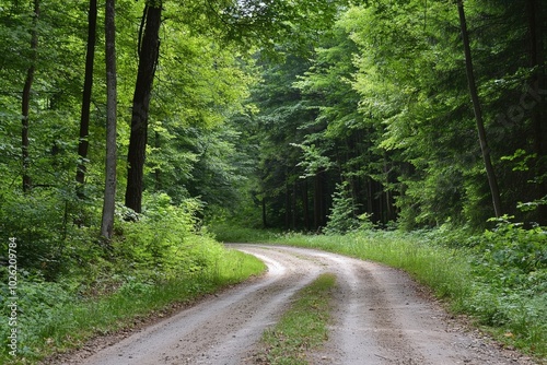 © Atlas, Naklejka premium Winding dirt road through lush green forest at midday under bright blue sky