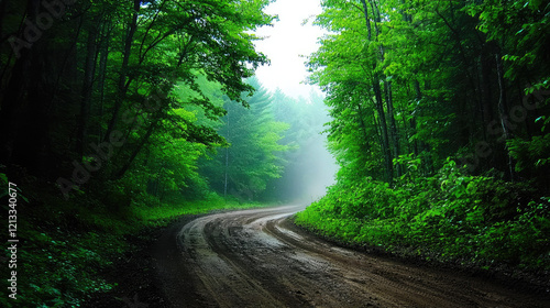 © Smart AI, Obraz premium Winding dirt road through lush green forest in misty atmosphere
