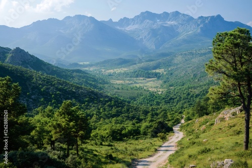 © Gatherina, Fototapeta premium Winding dirt road through lush green valley leading to majestic mountains