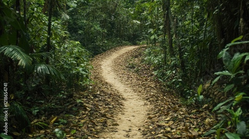 © Pannee, Obraz premium Winding dirt trail cutting through a dense forest with fallen leaves scattered on the ground.