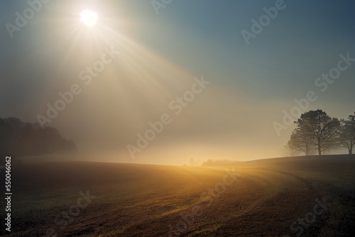 © surassawadee, Obraz premium Winding Farm Road through Foggy Landscape - fields, meadow, sun during sunrise