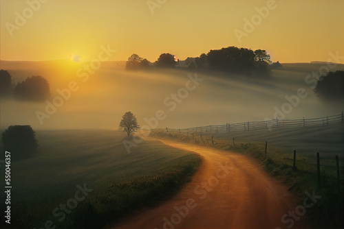 © surassawadee, Obraz premium Winding Farm Road through Foggy Landscape - fields, meadow, sun during sunrise