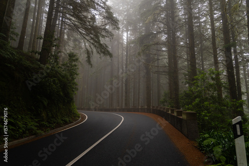© Stoca, Naklejka premium Winding foggy road in moody pine forest Horizontal